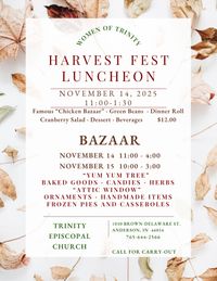 Women of Trinity will hold their Annual HarvestFest Luncheon and Bazaar on Friday November 14th. A lovely lunch will be served from 11:00-1:30. The Bazaar with many holiday gifts, baked goods and candies, and crafts will be open from 11:00-4:00. The Bazaar will also be open on Saturday November 15th from 10:00-3:00.